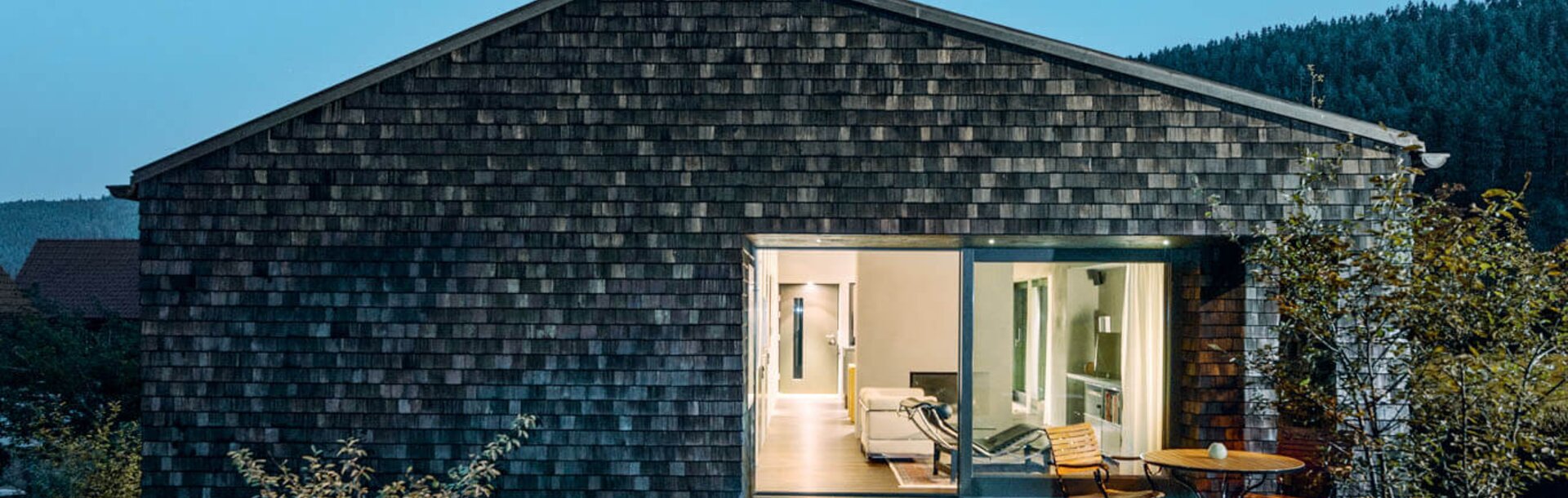 V protiklade ku kontrastnej bielej modernej architektúre, by „dom v čiernom“ chcel byť časťou krajiny. Treba však zabrániť poveternosti zahryznúť sa: impregnovalo sa a natrelo dvakrát s ADLER Pullex Plus-Lasur v odtieni Wenge, čím je drevená fasáda optimálne chránená pred slnkom a vlhkosťou. Prirodzený charakter okien zabezpečujú striekacie a máčacie lazúry línie ADLER Aquawood. Farebný koncept fasády preniesli architekti aj do interéru. Tmavé steny a stropy, ako aj podlahy a nábytok z dymového duba prepájajú kľud a bezpečnosť. Nejde tu o reprezentáciu, ale nájsť kľud a pohodu.