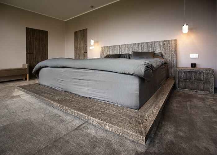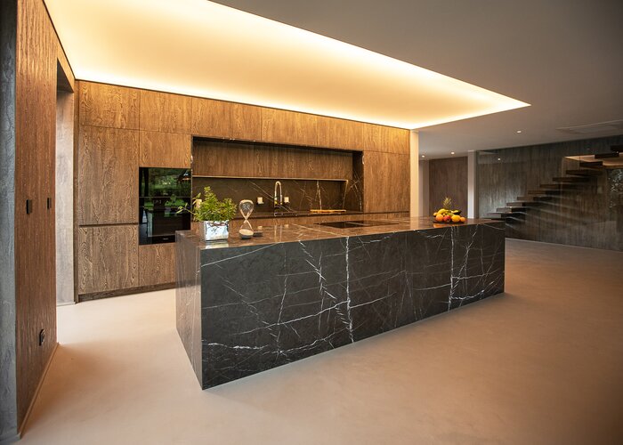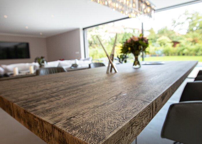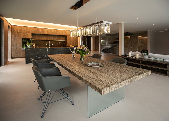 Túto špeciálnu povrchovú úpravu vytvorenú na mieru nájdete na kuchynskej linke, jedálenskom a konferenčnom stole, v zádverí aj kúpeľni, schodoch alebo napríklad na dverách a okolitom obložení. Tento spoločný prvok – starý dub s patinou – dokonale ladí s tlmeným sivobéžovým náterom stien, spája celý interiér a dodáva mu dojem pokojnej elegancie. Vila tak ani cez niektoré chladno pôsobiace moderné materiály – ako je chrómový povrch lustra nad jedálenským stolom, hladká betónová podlaha, oceľové podnože stoličiek alebo kuchynský ostrovček s povrchom vyhotoveným z čierneho mramoru – vôbec nevyvoláva pocit odťažitosti a neosobnosti, ale naopak pôsobí veľmi príjemne. V byte dcéry bola na nábytku a dverách použitá dubová dyha morená na svetlý odtieň moridlom Arova Spritzbeize Weiss a dokončená transparentným dvojzložkovým PUR lakom na nábytok Ratiopur G10/Legnopur G10. Ten dodal požadovanú trvanlivosť a odolnosť a zároveň nechal vyniknúť bielo morený dub. Interiér s čistými líniami nábytku tak pôsobí sviežo a vzdušne – presne tak, ako si to mladá dáma priala. Ako je vidieť, spolupráca odborníkov, ktorí do svojej práce dávajú srdce, prináša vskutku výnimočné výsledky. A použitie produktov vo vysokej kvalite a so špičkovou výdržou je pomyselnou korunou celého projektu.