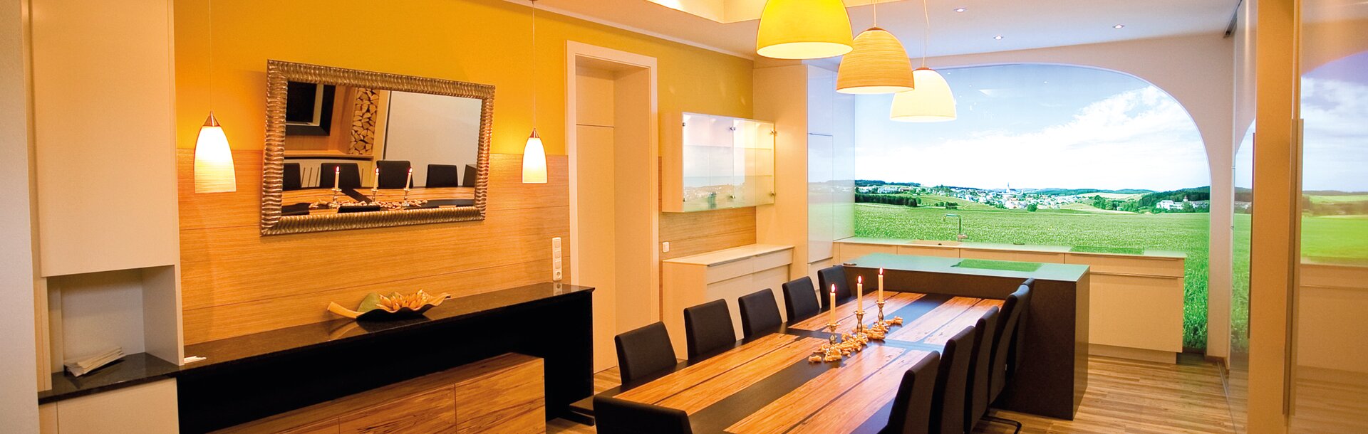 „Veľkou, zozadu podsvietenou sklenenou stenou sa nám podarilo úplne zmeniť charakter miestnosti, nezostala ani stopa po sklade,“ hovorí Katzmaier. Miestnosť fascinuje prekrásnou panorámou idylického Reichenthalu – skoro ako pohľad z okna. Kolektív „Katzmaierovcov" tam chce ukázať, čo všetko je možné vyrobiť z rôznych materiálov za pomoci kreatívnych nápadov: „Najväčšie čelá sme nalakovali s ADLER Pigmopur a pomocou ADLER Legnopur G90 im dodali lesk. Na to prišla ešte jedna vrstva ADLER PUR-Antiscratch HQ pre zvýšenie odolnosti a odolnosti voči poškriabaniu,“ popisuje stolárka, ktorá pred 10 rokmi prevzala podnik po rodičoch. Teraz sa ona a jej tím často stretáva za srdcovkou novej miestnosti: veľkým, variabilným stolom, ktorý zaujme kombináciou buka a dymového duba. „Dielce sme olemovali novým spôsobom, aby sme nestratili nádherný efekt prírodných dýhových okrajov," vysvetľuje Katzmaier. Sviežo-drzá kombinácia jednej hladkej a jednej nápadnej dreviny sa použila aj na ostatnom nábytku - a taktiež bola prelakovaná s ADLER Legnopur G90.