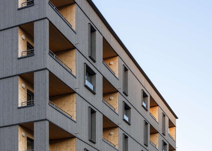 Na realizáciu štyroch dvorov vyvinuli balloon architekten konzistentný dizajnový a materiálový koncept, ktorý sa zameriava na obnoviteľné suroviny, ako je drevo. Tri dvory plánované balloon architekten boli realizované ako hybridné drevostavby, severozápadný dvor navrhnutý Hohensinn Architektur ako celodrevená stavba: „Celé developerské jadro sme realizovali ako masívnu drevostavbu – šesťpodlažný obytný súbor je teda prvý realizovaný projekt triedy budov 5 (GK5) v Rakúsku z dreva,“ hovorí architekt Branko Savatović z Hohensinn Architektur. Fasády boli natreté firmou Strobl sivou vodoriediteľnou lazúrou ADLER Lignovit Platin, ktorá svojim špeciálnym efektom „predbieha“ prirodzené zosivenie dreva a zaisťuje rovnomernú patinu hneď od začiatku. Navyše je možné vďaka nej úplne vypustiť pracný obnovovací náter - veľká výhoda pri každej viacpodlažnej budove. Pri realizácii však architekti navrhli rôzne nuansy: balloon architekten zvolili pri troch blokoch fasády z hrubo rezaného smreka, ktorý bol najprv impregnovaný Lignovit Lasur v odtieni Naturgrau a následne opatrený vrchným náterom Lignovit Platin v odtieňoch Pyritgrau, Quartz Grau. Vzniká tak harmonická gradácia rôznych odtieňov sivej, na ktorú nadväzuje štvrtý severozápadný dvor realizovaný firmou Hohensinn Architekten so svetlosivou fasádou: „Chceli sme dosiahnuť viac svetlosti a ostrosti čo najsvetlejším farebným tónom bez toho, aby sme narušili celkový dojem,“ vysvetľuje architekt. Po detailnej konzultácii s architektom ADLER Manfredom Höfurthnerom vyvinulo laboratórium ADLER špeciálny odtieň, v ktorom bol ADLER Lignovit Platin vo farbe Quarzgrau zosvetlený o ďalší podiel bielej. Týmto spôsobom sa štyri nádvoria Quartier 7 spájajú a tvoria harmonický a súdržný celok, v ktorom sa na druhý pohľad objaví mnoho jemných rozdielov – rovnako individuálnych ako ľudia, ktorí v tomto ukážkovom ekologickom projekte nachádzajú nové bývanie a životný priestor.